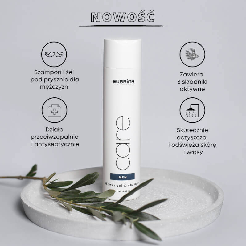 Subrina Care Men Shower Gel & Shampoo to wyjątkowy, wielofunkcyjny kosmetyk 2w1 zaprojektowany specjalnie dla mężczyzn. To szampon do włosów i żel pod prysznic w jednym. Lekka formuła doskonale oczyści i odświeży włosy, a jednocześnie odżywi i ukoi skórę całego ciała. Zawarty tu ekstrakt z jałowca działa przeciwzapalnie i antyseptycznie, poprawia mikrokrążenie skóry głowy wzmacniając cebulki i pobudzając włosy do wzrostu. Ekstrakt z liści oliwnych to wsparcie w regeneracji zniszczonych włosów, zapewnia nawilżenie i blask pozostawiając pasma odpowiednio nawilżone i wygładzone. Lekka formuła kosmetyku jest na tyle delikatna, że możesz sięgać po niego codziennie.