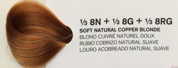 Dla uzyskania koloru Delikatny naturalny miedziany blond, należy zmieszać 1/3 8N, 1/3 8G i 1/3 8RG.
